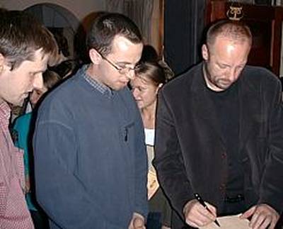 附圖解說:因為在訪談會場都沒人照相,我也因此放棄偷拍偶像,只好在網路上抓圖聊以自慰。普瑞斯納談《藍色情挑》時,照例稱讚了一下茱莉葉畢諾許的認真、敬業。看看第三張圖,普瑞斯納當時好胖啊……。第一張圖(左)是他在別的地方訪談時的照片(2001年),模樣跟我那天看到的差不多,連講話時的小動作都一樣。真羨慕第四張圖裡那些人拿到他的親筆簽名!